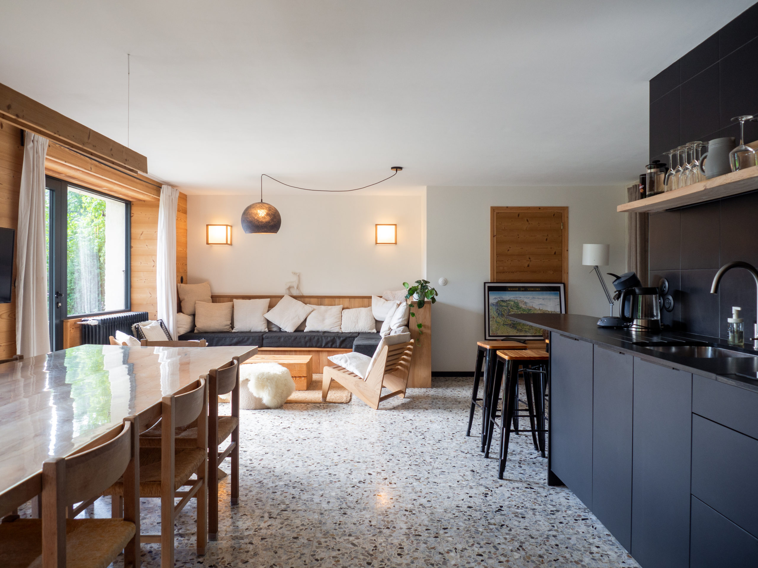 Le gîte (180 m²) offre 4 grandes chambres avec balcon, salle de bain et WC privés ainsi qu’un vaste séjour et salle à manger avec cuisine toute équipée.